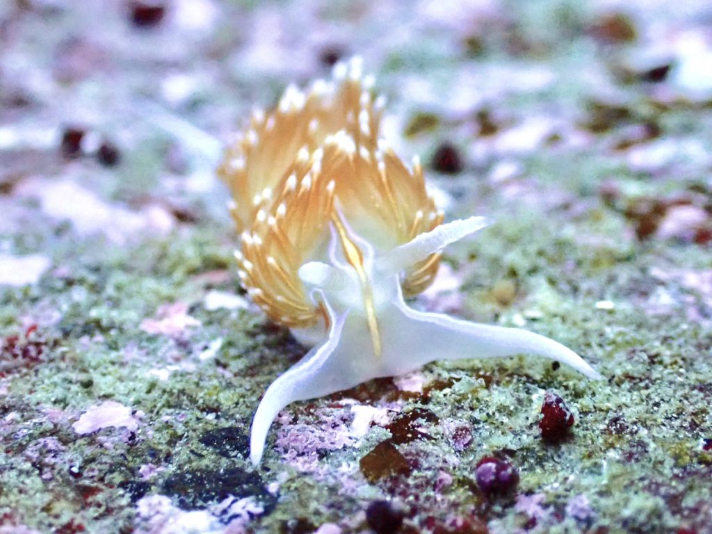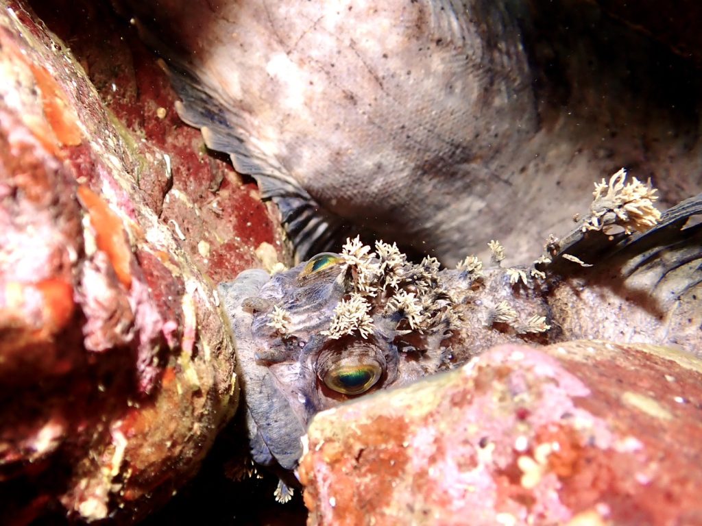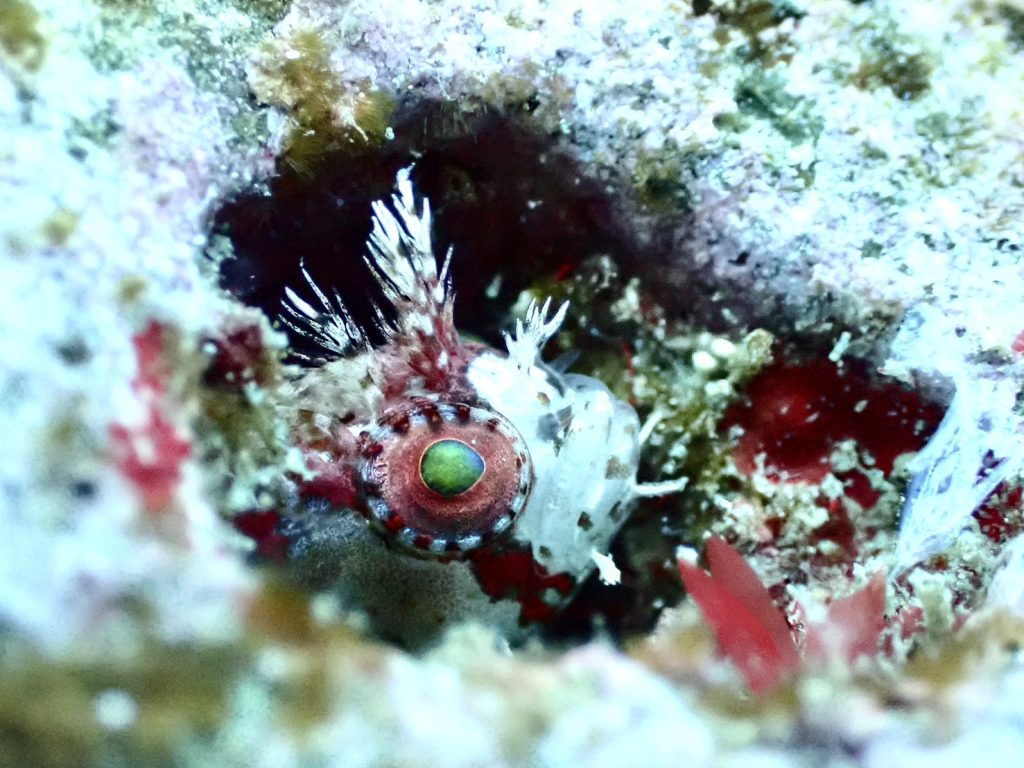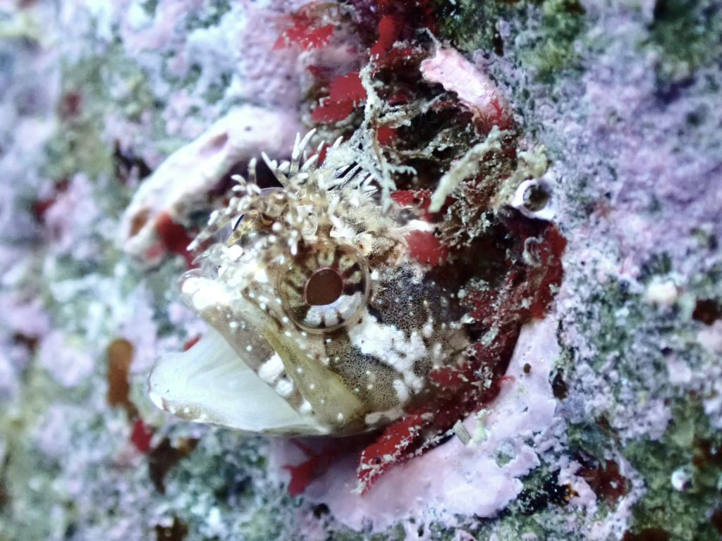 水中は、時化の影響で少し濁り気味。それでも海が動いたあとの独特の雰囲気があり、潜り始めからわくわくするコンディションでした。そんな中、今日は嬉しい出会いがありました。フサギンポがペアになって仲良く寄り添っていたんです。冬が近づくと見られる微笑ましい光景で、この季節を象徴するシーンのひとつです。